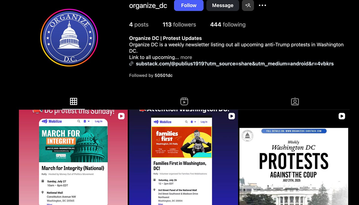 Welcome back to Organize DC– a weekly newsletter helping protestors/organizers peacefully connect, collaborate, and demonstrate against the executive overreach of the Trump administration.